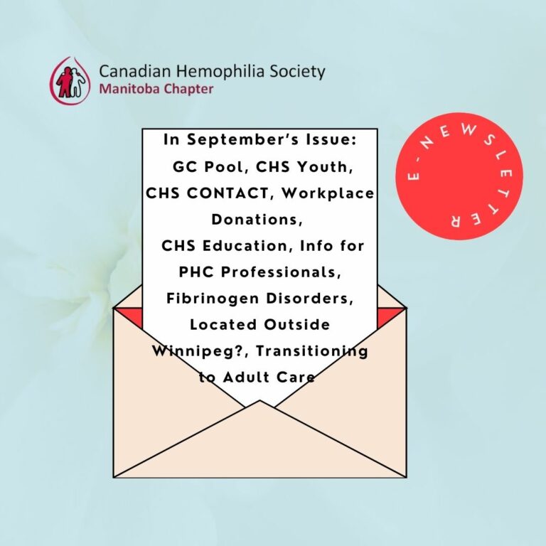 Grey Cup Pool 2025, CHS Youth Event, CHS CONTACT Update, Workplace Donation Campaigns, CHS Education Catalogue, Info for Primary Healthcare Professionals, Fibrinogen Disorders, Located Outside Winnipeg?, WFH – Women Transitioning to Adult Care